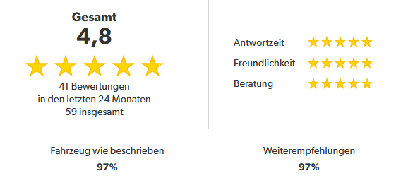 Der Verlauf des Verkaufs wurde nach Besichtigung des KFZ in genau verabredeten Schritten exakt eingehalten. Die Anmeldung des KFZ in einem von Oldenburg weit entfernten Ort konnte dadurch sehr zügig durchgeführt werden. Innerhalb von wenigen Tagen seit Erstkontakt über mobile.de war ich stolzer Besitzer eines neuen Autos.H. ★★★★★